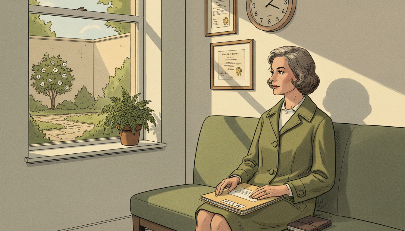 Please generate a 16:9 image in mid-century American editorial illustration style depicting panel 3 of 12. Make the characters and style consistent with the prior panel. The scene shows Rachel Carson sitting alone in a 1960 doctor's waiting room after receiving a cancer diagnosis. She holds a medical file on her lap and gazes out a window at a small garden. The color palette is muted hospital greens, cream, soft gray, with a shaft of afternoon light. Emotional tone: grave but resolute. Specific details: (1) a period wall clock reading late afternoon, (2) framed medical certificates on the wall, (3) Carson in a simple travel coat, her composure intact, (4) a closed file folder marked with a doctor's name, (5) her hand resting on a small leather notebook, (6) a potted fern by the window. Generate the image immediately without asking clarifying questions.In 1960, in the middle of her research, doctors told Rachel Carson she had breast cancer. The treatments were brutal and the prognosis was uncertain. Most people would have stopped writing. Carson told only her closest friends and kept working, because she understood something about time that most people only learn at the end: the question was not whether she could finish the book, but whether the truth would reach the public before it was too late.