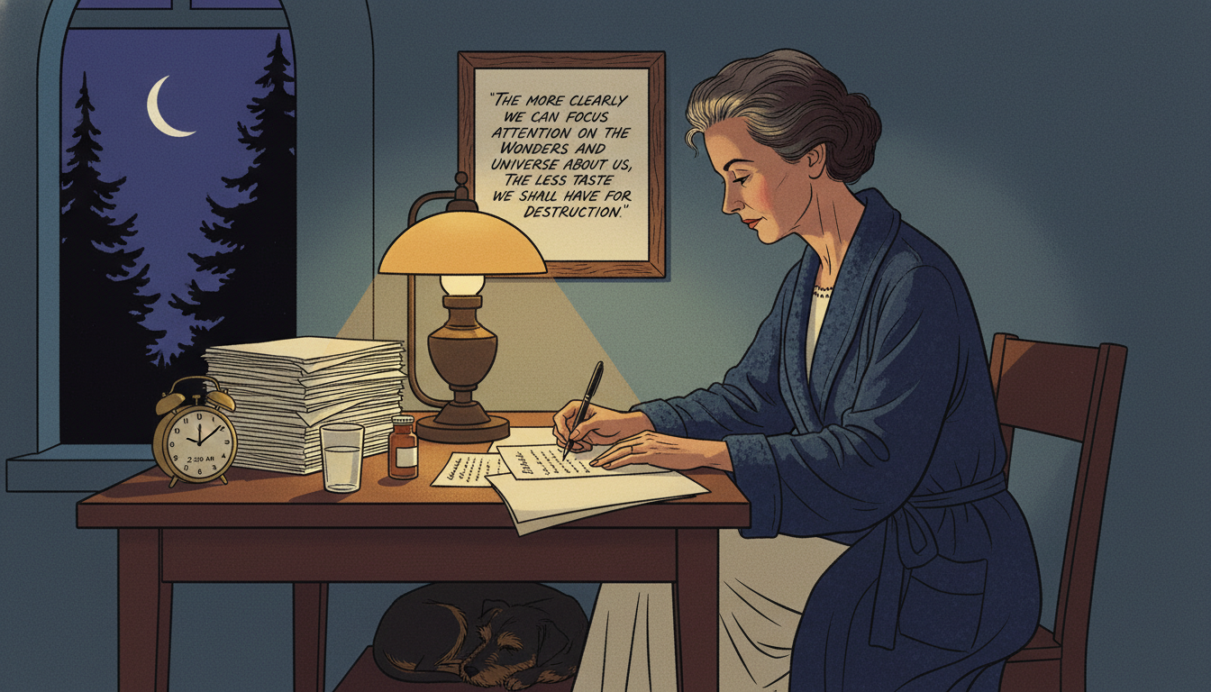 Please generate a 16:9 image in mid-century American editorial illustration style depicting panel 4 of 12. Make the characters and style consistent with the prior panel. The scene shows Rachel Carson writing late at night at her desk in 1961, a single lamp illuminating her papers. She wears a dark blue bathrobe over a nightgown; her hair is thinning slightly from treatment. Through a window, we see a crescent moon over silhouetted trees. The color palette is deep blues, amber lamplight, shadow, cream. Emotional tone: fragile determination. Specific details: (1) typed manuscript pages stacked beside her, (2) a clock showing 2:00 AM, (3) a glass of water and medication bottle on the desk, (4) her dog sleeping at her feet, (5) a pen in her hand mid-sentence, (6) a framed handwritten quote on the wall. Generate the image immediately without asking clarifying questions.Carson wrote Silent Spring at night, when her pain was most bearable and the house was quiet. She worked slowly because she refused to publish anything she could not defend. Her editor grew anxious; her publisher pressured her to hurry. She would not be hurried. Every sentence had to be true — and every footnote had to be real.