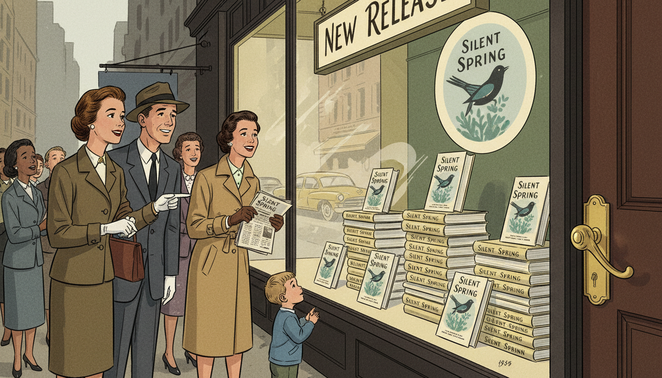 Please generate a 16:9 image in mid-century American editorial illustration style depicting panel 5 of 12. Make the characters and style consistent with the prior panel. The scene shows a 1962 bookstore window in New York City displaying stacks of the book "Silent Spring" with its iconic cover. A small crowd has gathered to look at the display. The color palette is muted greens, cream, warm yellows, city grays. Emotional tone: quiet anticipation turning to excitement. Specific details: (1) a hand-lettered "New Release" sign, (2) a well-dressed 1962 couple pointing at the display, (3) reflections of passing cars in the glass, (4) a woman holding a copy of the book and a newspaper, (5) a small child looking up curiously, (6) the bookstore's elegant brass door handle. Generate the image immediately without asking clarifying questions.Silent Spring was published on September 27, 1962. It sold over 100,000 copies in the first weeks. Readers who had never thought about ecology discovered, chapter by meticulous chapter, that the miracle chemicals they had been told were safe were in fact poisoning birds, fish, insects, and perhaps themselves. The book did not rage. It explained. And that made it unstoppable.