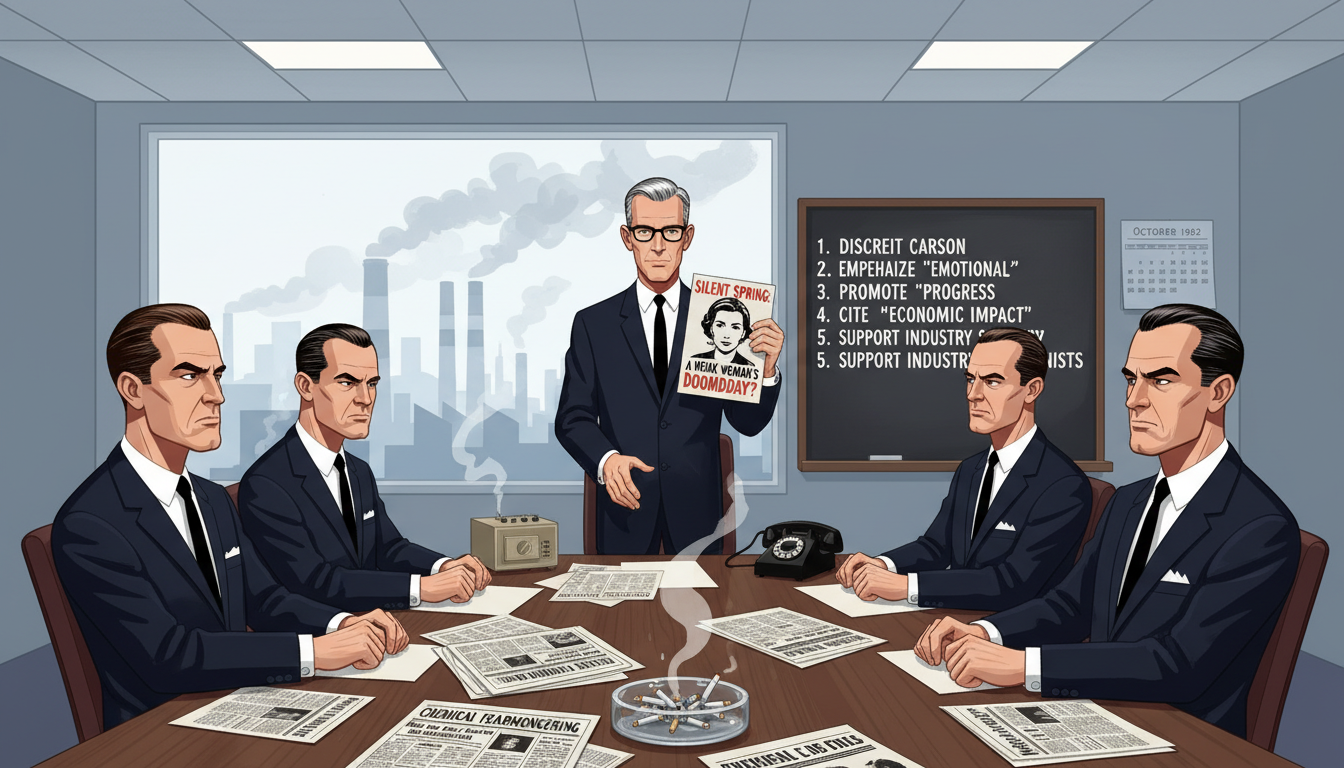 Please generate a 16:9 image in mid-century American editorial illustration style depicting panel 6 of 12. Make the characters and style consistent with the prior panel. The scene shows a 1962 corporate boardroom inside a large American chemical company, with executives in dark suits reviewing press materials attacking Rachel Carson. One executive holds up a pamphlet with Carson's photograph on it. A large window reveals an industrial skyline with smokestacks. The color palette is cold grays, corporate blues, harsh fluorescent white. Emotional tone: calculated hostility. Specific details: (1) a conference table covered with press kits and newspapers, (2) a blackboard listing talking points against the book, (3) executives in conservative 1960s business suits, (4) an ashtray with cigarettes, (5) a telephone and intercom, (6) a calendar showing October 1962. Generate the image immediately without asking clarifying questions.The chemical industry spent about a quarter of a million dollars — enormous money for 1962 — trying to destroy Rachel Carson. They hired scientists to write critical reviews. They mailed pamphlets to newspapers. They called her hysterical, a communist sympathizer, a spinster who did not understand real science. None of them could find an error in her book. So they attacked her instead of her evidence.