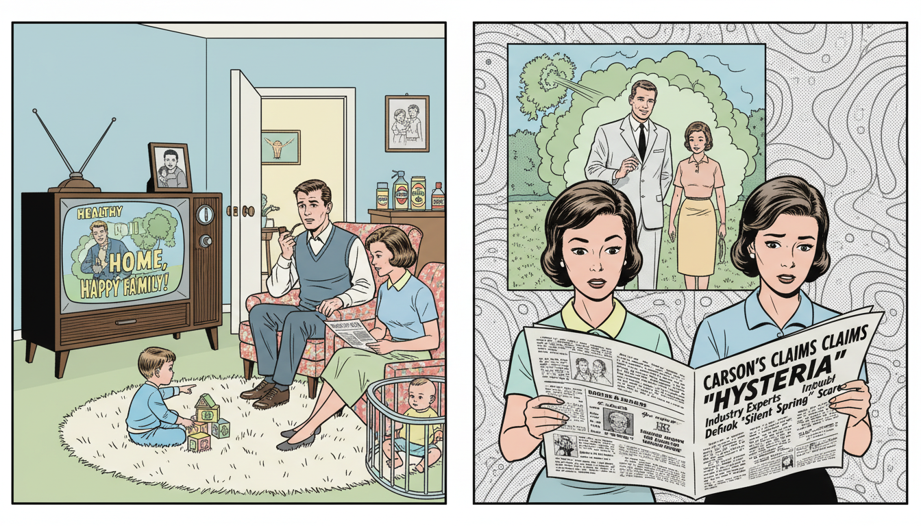 Please generate a 16:9 image in mid-century American editorial illustration style depicting panel 7 of 12. Make the characters and style consistent with the prior panel. The scene shows a split composition: on the left, a 1962 American living room where a family watches a television ad showing smiling actors in a pesticide-sprayed suburban yard; on the right, the same family reading a newspaper headline attacking Rachel Carson. The color palette is 1960s suburban pastels contrasted with newsprint gray. Emotional tone: the quiet manipulation of public opinion. Specific details: (1) a vintage console television showing the ad, (2) a child playing on a rug, (3) a mother holding the newspaper with a puzzled expression, (4) a father in an armchair with a pipe, (5) pesticide products visible on a kitchen counter through an open door, (6) a family photograph on the TV set. Generate the image immediately without asking clarifying questions.The disinformation campaign worked on a familiar principle: if you cannot refute the facts, confuse the audience. Television ads showed happy families in chemically sprayed backyards. Ghost-written op-eds suggested Carson wanted children to die of malaria. For many Americans, the result was simple doubt — the most effective weapon misinformation has ever had. Carson understood that doubt, not disagreement, was the enemy of knowing.