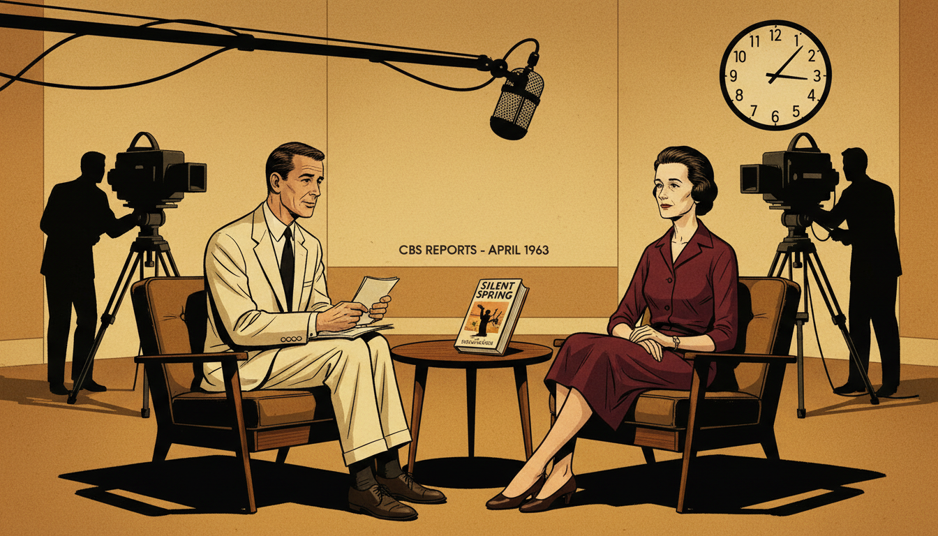 Please generate a 16:9 image in mid-century American editorial illustration style depicting panel 8 of 12. Make the characters and style consistent with the prior panel. The scene shows Rachel Carson on a CBS Reports television set in April 1963, seated across from journalist Eric Sevareid under studio lights. Carson is visibly thin from her illness but composed, wearing a dark tailored dress. Cameras and crew are visible in the background. The color palette is warm studio amber, shadow black, cream, burgundy. Emotional tone: quiet authority under pressure. Specific details: (1) large 1960s television cameras, (2) a studio clock, (3) a microphone on a boom arm, (4) Sevareid holding note cards, (5) Carson with her hands folded calmly in her lap, (6) a copy of Silent Spring on the small table between them. Generate the image immediately without asking clarifying questions.On April 3, 1963, more than ten million Americans tuned in to watch CBS Reports: The Silent Spring of Rachel Carson. Sponsors had pulled out; the network aired it anyway. On screen, Carson did not shout or sneer. She simply answered each question with the patience of someone who had checked her footnotes. Across from her, the industry's best-paid critic waved his arms and called her unscientific. By the end of the hour, millions of viewers could see which one of them was telling the truth.