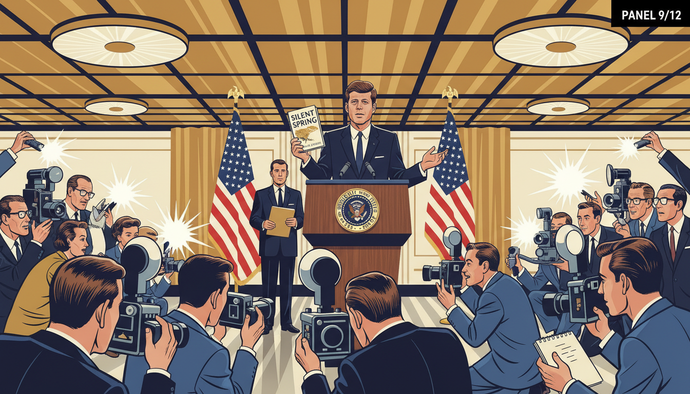 Please generate a 16:9 image in mid-century American editorial illustration style depicting panel 9 of 12. Make the characters and style consistent with the prior panel. The scene shows President John F. Kennedy at a 1962 White House press conference, holding up a copy of "Silent Spring" as he answers a reporter's question. Press corps and photographers with vintage cameras fill the foreground. The color palette is presidential navy, cream, gold, flashbulb white. Emotional tone: institutional recognition. Specific details: (1) Kennedy at a lectern with the presidential seal, (2) reporters with notepads and vintage press cameras, (3) American flags in the background, (4) Kennedy gesturing to the book, (5) a White House staffer holding a folder, (6) overhead studio lights reflecting off polished wood. Generate the image immediately without asking clarifying questions.When a reporter asked President Kennedy whether the government was investigating the pesticide problem, Kennedy answered, "Yes — and I think particularly, of course, since Miss Carson's book." He ordered his President's Science Advisory Committee to examine her claims independently. For a sitting president to cite a book by a female biologist was, in 1962, extraordinary. It was also the moment the industry knew they had lost the argument.
