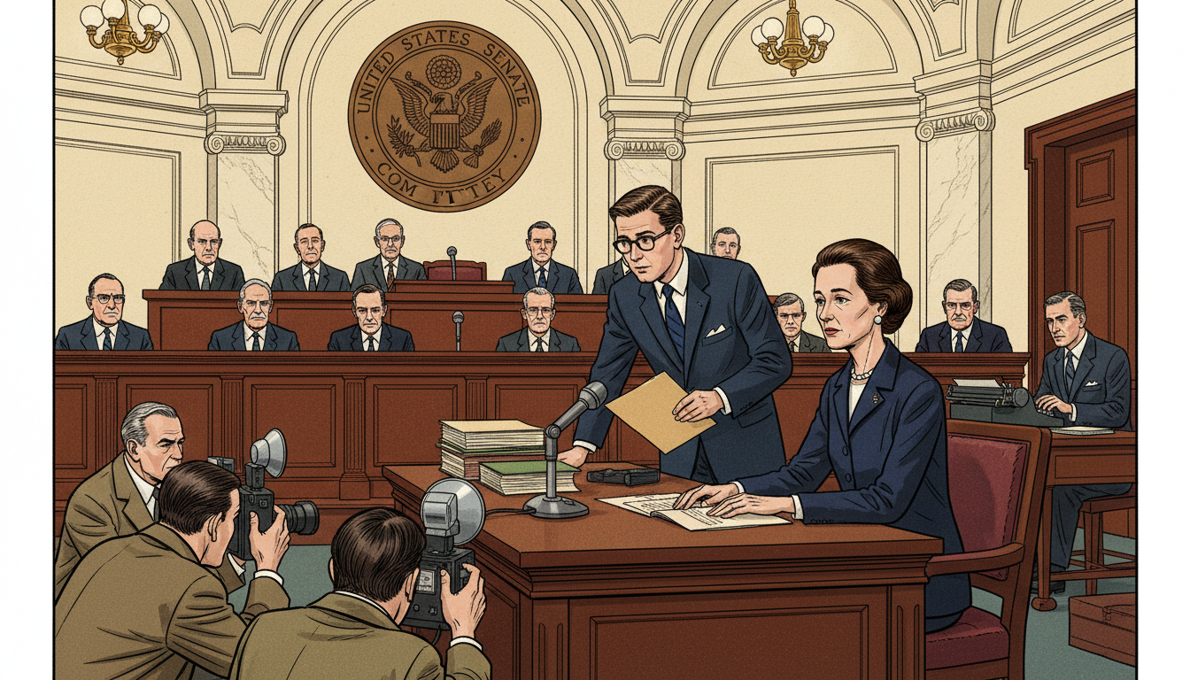Please generate a 16:9 image in mid-century American editorial illustration style depicting panel 10 of 12. Make the characters and style consistent with the prior panel. The scene shows Rachel Carson testifying before a 1963 U.S. Senate subcommittee. She sits at a witness table under a large vaulted ceiling, a microphone in front of her, facing a row of senators at a raised bench. Her appearance shows the toll of illness but her bearing is calm and dignified. The color palette is deep mahogany, cream marble, government navy, warm brass. Emotional tone: historic gravity. Specific details: (1) the Senate committee seal behind the senators, (2) stacks of documents at Carson's table, (3) press photographers kneeling in the foreground, (4) Carson wearing a modest dark suit and small pearl earrings, (5) an aide handing her a folder, (6) a stenographer at a small desk. Generate the image immediately without asking clarifying questions.On June 4, 1963, Carson was called before a Senate subcommittee. By then she could barely walk without pain. She did not mention her illness. Instead, over two days, she laid out her evidence, named the chemicals, and recommended concrete reforms — independent testing, public disclosure, and a citizen's right to a safe environment. One senator told her, "Miss Carson, we welcome you here. You are the lady who started all this."