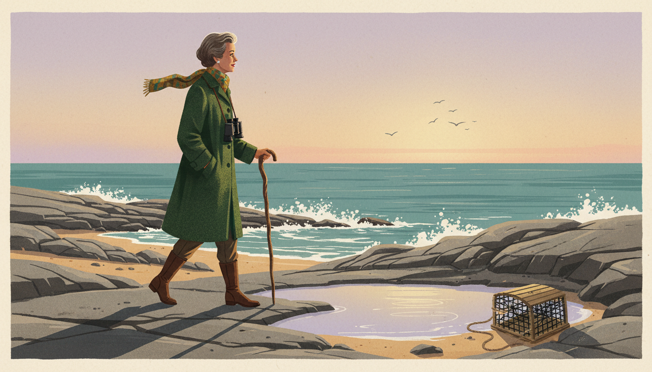 Please generate a 16:9 image in mid-century American editorial illustration style depicting panel 11 of 12. Make the characters and style consistent with the prior panel. The scene shows Rachel Carson walking alone along a rocky Maine coastline at golden hour in 1964, wearing a warm wool coat and a scarf, leaning slightly on a wooden walking stick. She gazes out over tide pools toward the ocean. Her expression is peaceful. The color palette is golden amber, deep teal ocean, weathered rock gray, pale lavender sky. Emotional tone: serene farewell. Specific details: (1) gentle surf breaking on the rocks, (2) seabirds in flight over the horizon, (3) a tide pool reflecting the sky, (4) a weathered lobster trap on the shore, (5) Carson's silhouette long in the low sun, (6) a pair of binoculars around her neck. Generate the image immediately without asking clarifying questions.Rachel Carson died on April 14, 1964, less than two years after Silent Spring was published. She had lived long enough to see a president confirm her findings, to testify before the Senate, and to know that the world had heard her. The sea she had loved all her life was a little safer because of her. So were the songbirds — and, eventually, the children who would grow up drinking cleaner water and breathing cleaner air.
