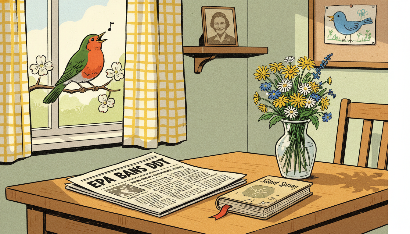 Please generate a 16:9 image in mid-century American editorial illustration style depicting panel 12 of 12. Make the characters and style consistent with the prior panel. The scene shows a newspaper front page from 1972 announcing the EPA ban on DDT, with the newspaper resting on a wooden table beside a vase of fresh wildflowers and a well-worn copy of "Silent Spring." Through an open window, a bright-eyed robin perches on a flowering branch, clearly alive and singing. The color palette is sunlit yellow, cream, deep green, robin red-orange. Emotional tone: hopeful vindication. Specific details: (1) the newspaper headline reading "EPA BANS DDT", (2) the dog-eared book with a bookmark, (3) sunlight streaming through a gingham curtain, (4) the robin caught mid-song, (5) a child's drawing of a bird pinned to a corkboard, (6) a small framed photograph of Rachel Carson on a shelf. Generate the image immediately without asking clarifying questions.In 1972, eight years after her death, the United States banned most uses of DDT. Her carefully footnoted book had done what no lawsuit and no protest could: it had changed how Americans decided what was true. The Environmental Protection Agency itself had been created partly because of the public conversation she started. The birds came back. And generations of scientists learned that rigorous evidence, patiently explained, is still the most dangerous thing in the world to a lie.